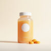 Un envase de suplemento de Vitamina C en tabletas efervescentes, con un diseño fresco y limpio usando tonos cítricos como naranja y amarillo pálido. Sugiere protección y revitalización para el cuerpo.